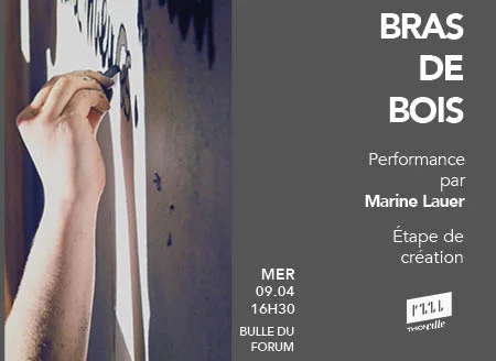 Résidente au sein des ateliers du LED et étudiante aux Beaux-Arts de Metz, Marine Lauer élabore actuellement une nouvelle performance, intitulée Bras de bois.