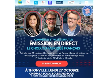 Assistez à un évènement exceptionnel, en public, l’enregistrement en live d’une émission de Moselle TV animée par Jérôme Bergerot, Directeur de la chaîne avec M. Pascal Madry directeur de l'Institut pour la Ville et le Commerce et Mme Nadège Risse, présidente de la CPME de la Moselle.