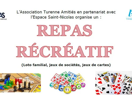 L’Association Turenne Amitiés en partenariat avec l’Espace Saint-Nicolas organise un repas récréatif (logo familial, jeux de sociétés, jeux de cartes)