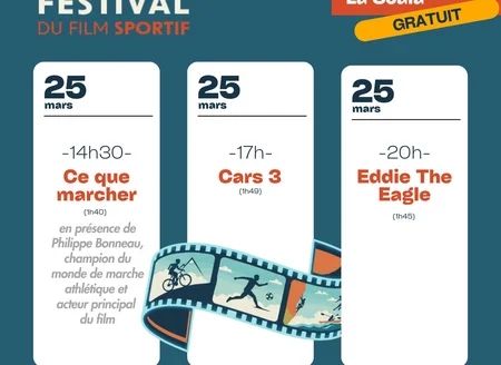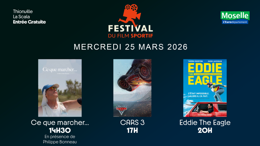 Dans le cadre du Festival du film sportif, projection à la Scala de 3 film le mercredi 25 mars : CE QUE MARCHER, en présence de Philippe Bonneau, CARS 3 et EDDIE THE EAGLE.