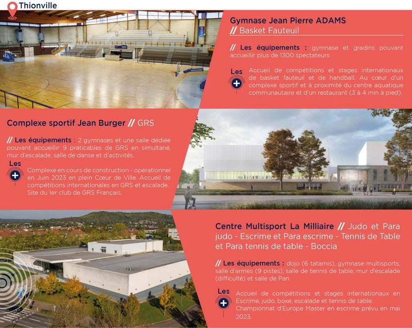 En 2020, 3 installations sportives de Thionville ont été labellisées Centre de Préparation aux Jeux pour 4 disciplines olympiques (escrime, judo, tennis de table et GRS) et 5 paralympiques (para escrime, para judo, para tennis de table, boccia et basket fauteuil)
