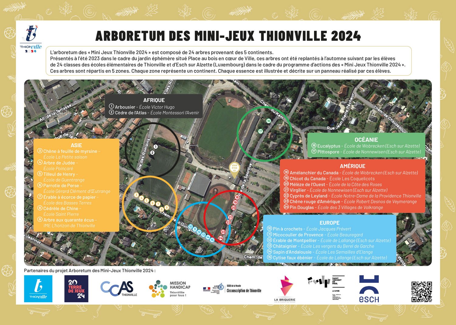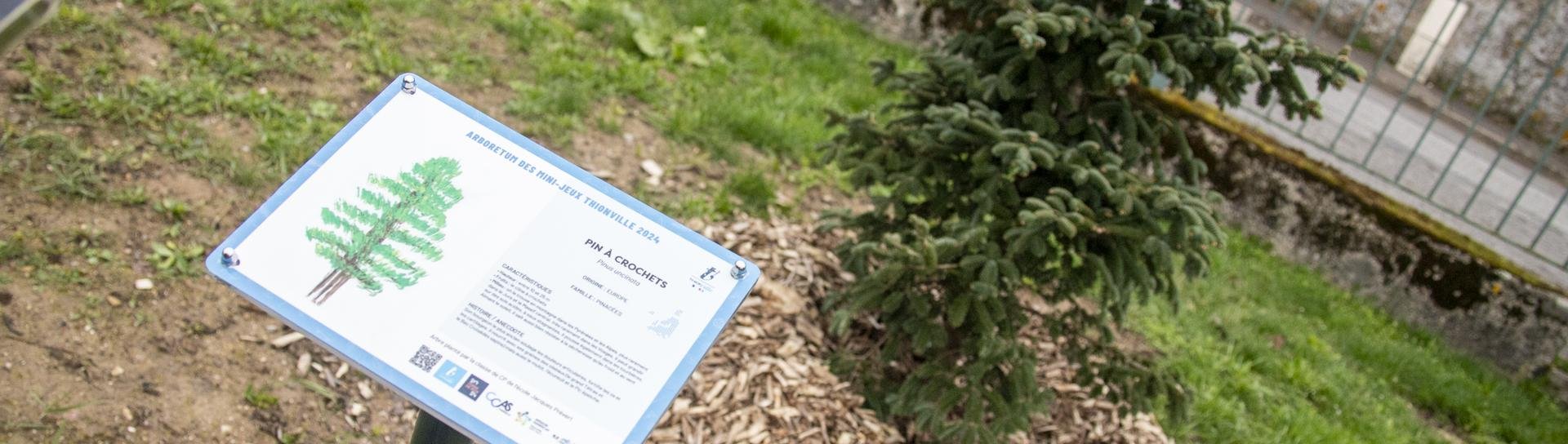 Laisser une trace, un héritage du programme d’actions des "Mini Jeux Thionville 2024" après 2024 mais aussi participer au renouvellement des arbres de la Ville de Thionville en lien avec la politique environnementale. L’arboretum des "Mini Jeux Thionville 2024" se compose de 24 arbres provenant des cinq continents. Présentés durant l’été 2023 dans le cadre du jardin éphémère situé place au Bois en cœur de Ville, ces arbres ont été replantés à l’automne suivant par les élèves de 24 classes des écoles élémentaires de Thionville et d’Esch-sur-Alzette (Luxembourg). Au total, ce sont 2700 enfants qui ont pris part au projet et qui ont été accompagnés dans cette démarche par le service des espaces verts et l’équipe des stades de la Ville de Thionville. Les arbres sont répartis en cinq zones sur le stade de Guentrange, matérialisant chacune un continent. Chaque essence est illustrée et décrite sur un panneau réalisé par les élèves et fabriqué par leurs aînés du lycée Saint-Vincent-de-Paul d’Algrange. Les supports des 24 panneaux ont, quant à eux, été réalisés par les élèves du Lycée La Briquerie de Thionville.