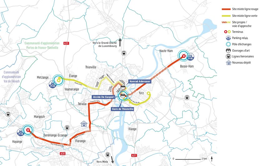 Citézen consiste en la création de 32 kilomètres de lignes de bus répartis en une ligne rouge, entre Hayange et Basse Ham, et une ligne verte entre Metzange et Yutz.